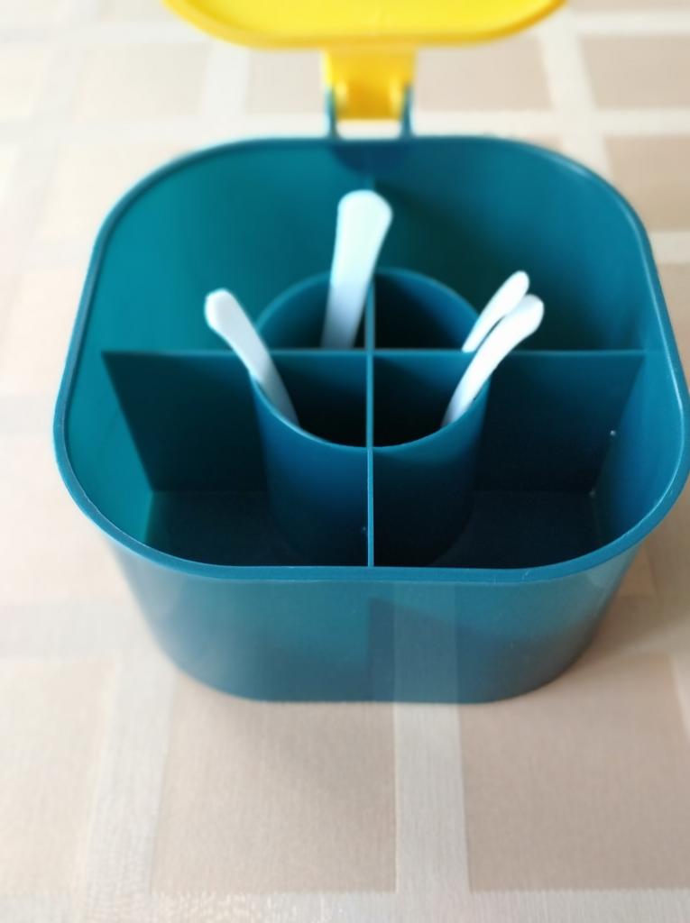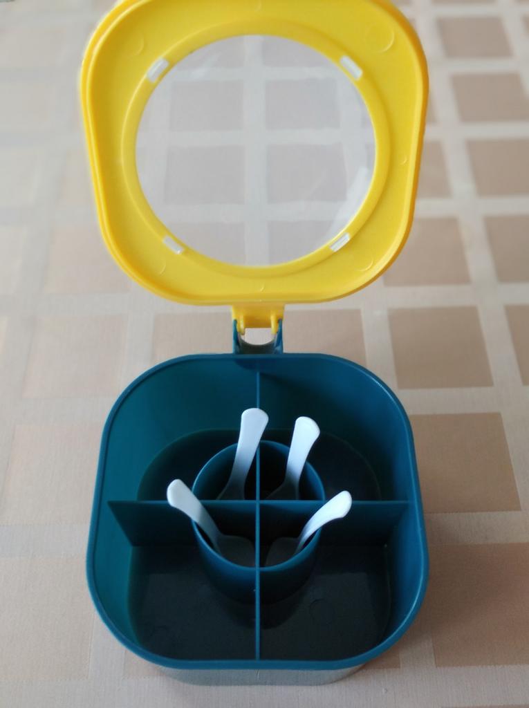 Sada kulatých plastových dóz na koření 4 v 1 s integrovanými lžícemi, nádobami na sůl, pepř a koření pro organizér na kuchyňskou desku