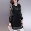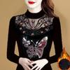 Women Clothing Vintage Elegant Flower Flocking High Collar Basic T-shirt Autumn Winter Sexy Mesh Long Sleeve Slim Pullover Tops